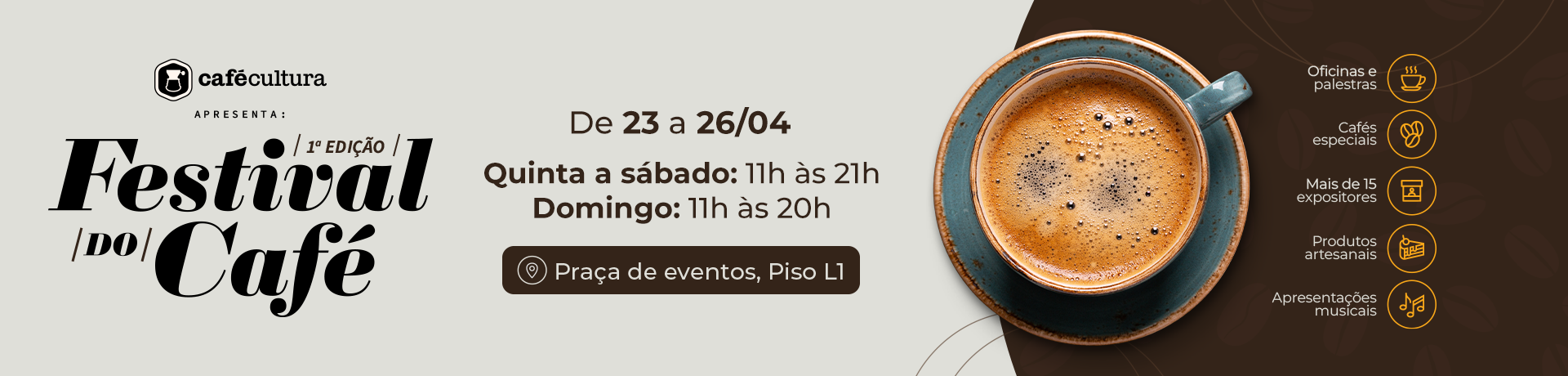 De 23 a 26 de abril, a Praça de Eventos, localizada no Piso L1, na entrada principal do shopping, se transforma em um cenário de aromas marcantes, encontros e momentos pensados para serem vividos sem pressa.